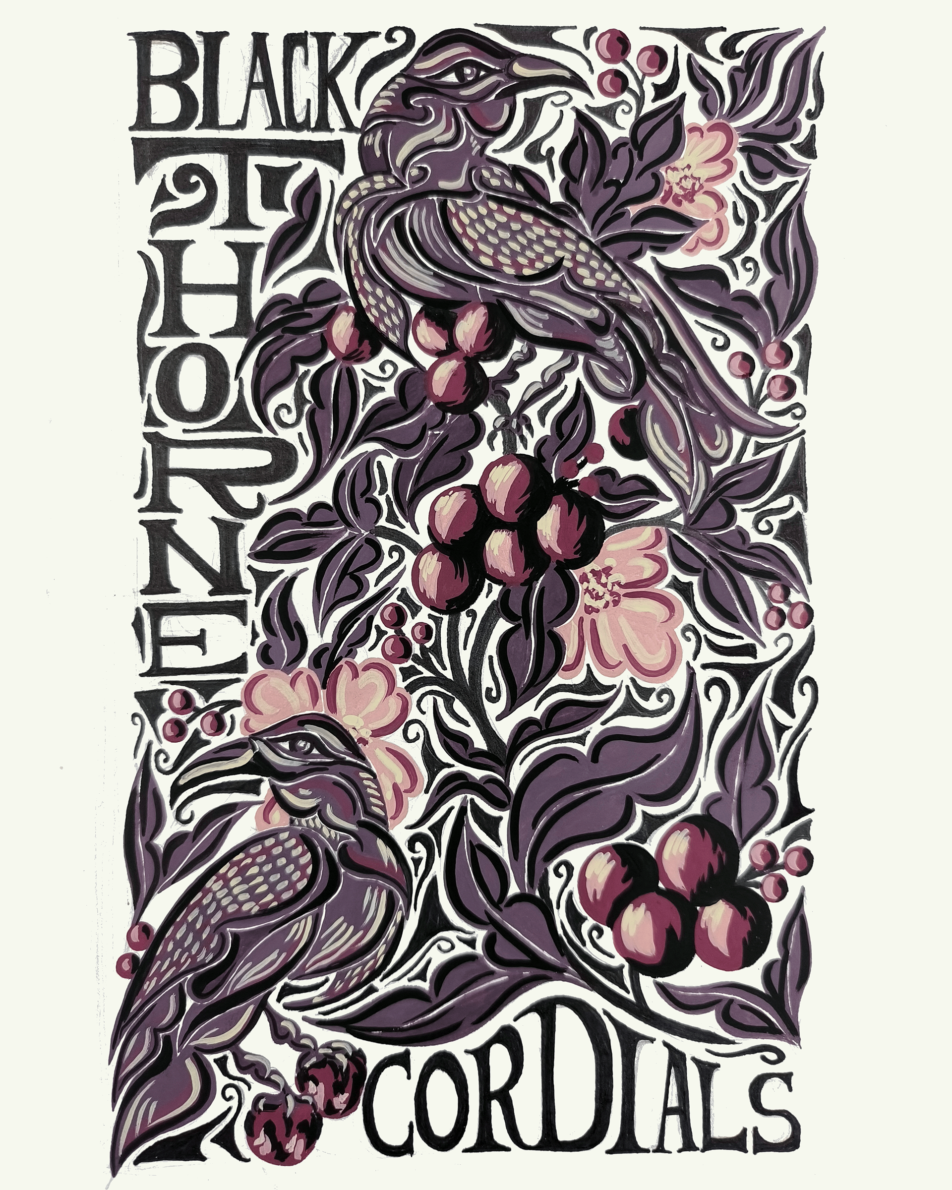 Founded in 1872, Blackthorne Cordials preserves the old art of steeping fruits and botanicals into rich liquers. During the Victorian Age, the signature cherry blend, watched over by a pair of crows, used to be known to 'mend a broken heart or break a faithful vow.' Today, the legacy carries on the Blackthorne Cordials - dark, sweet and timeless.