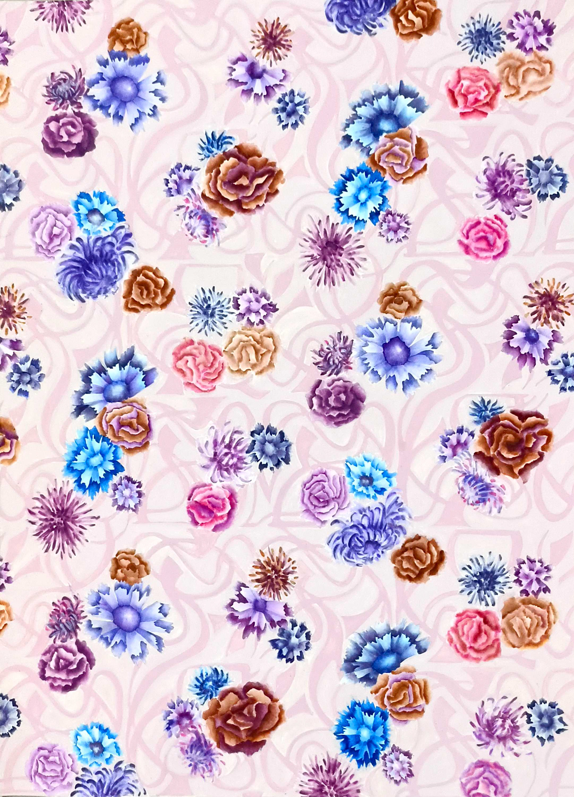 Fleur Évanescente is a study in restraint and opulence — a classic watercolour floral rendered in photorealistic washes of dye over a tone-on-tone Art Nouveau ground. Fall flowers drift across the surface like pressed blooms on antique stationery, their hyper-detailed petals contrasting with the soft, ornamental underlayer. The pattern revisits the lost finesse of Alphose Mucha's posters of the 19th-century, merging archival European techniques with a contemporary non-directional layout.